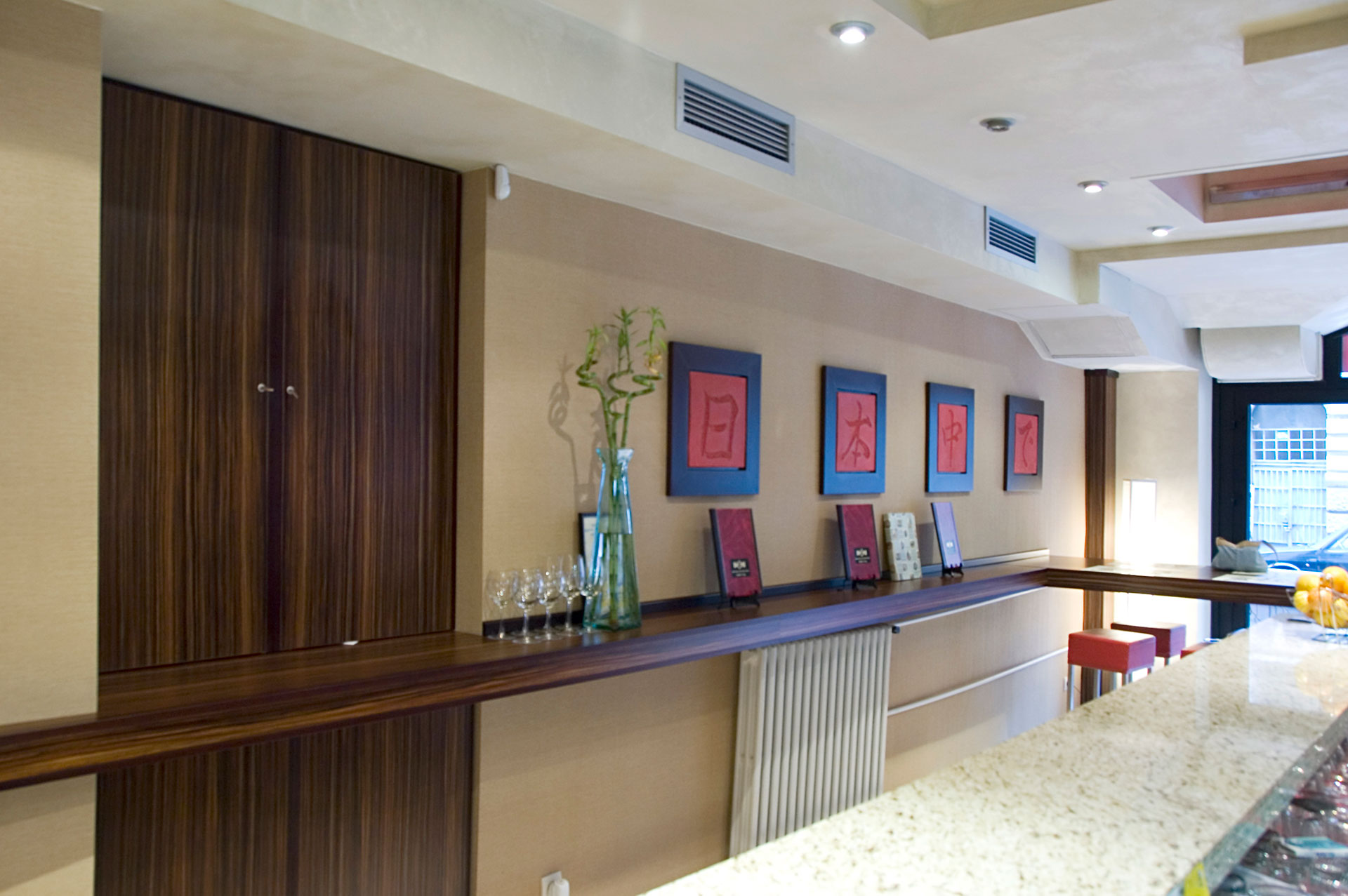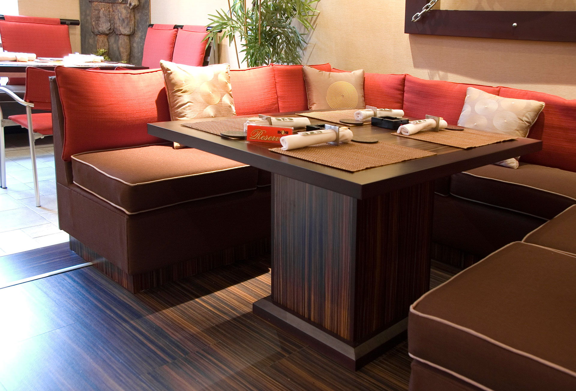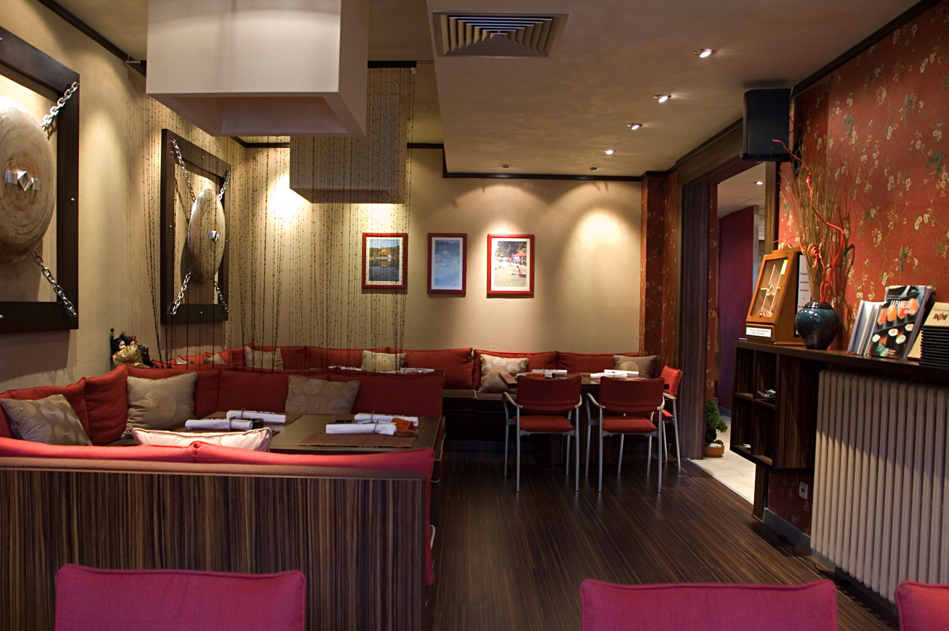 Kombinovanjem jednostavnih linija i formi, stvoren je razigran dizajn ovog enterijera koji pleni dobrom atmosferom i unosi osećaj razdraganosti u prostor. Uklapanjem boja i tekstura, uz korišćenje „živih“ boja na jastučićima, diskretnom rasvetom, i uticajem azijske kulture, stvoren je prostor koji poziva na druženje i uživanje.