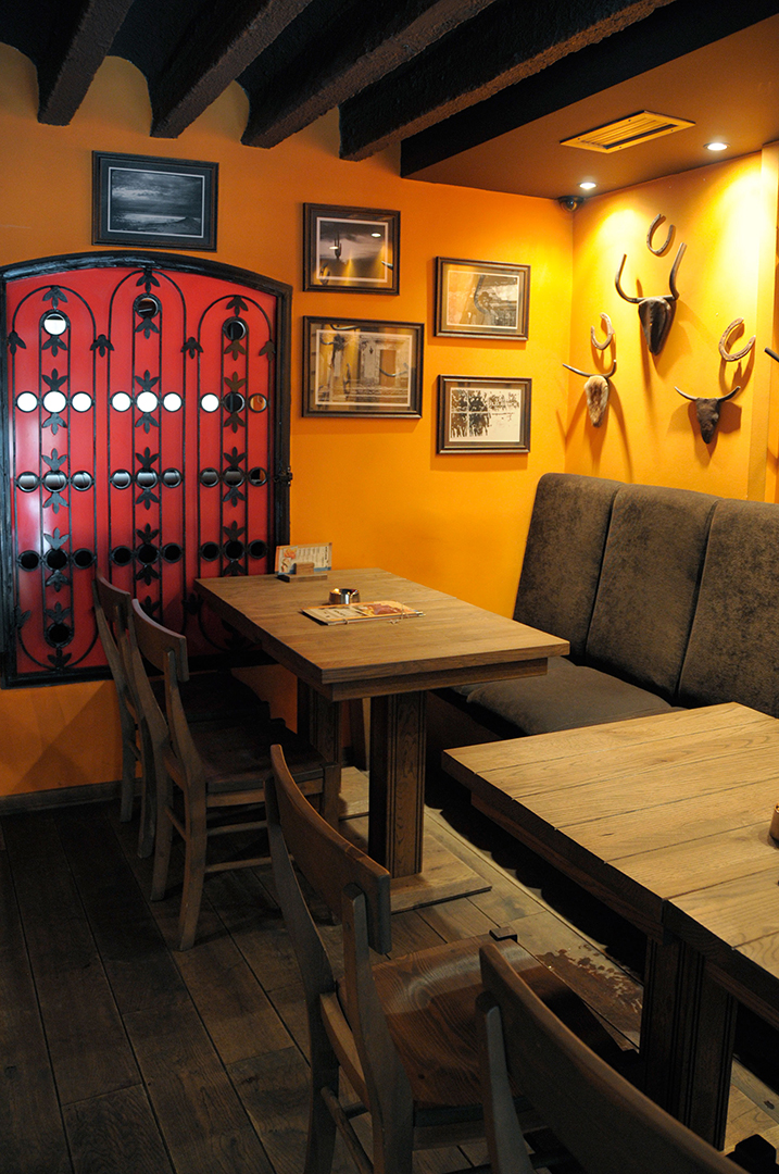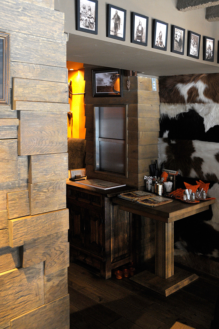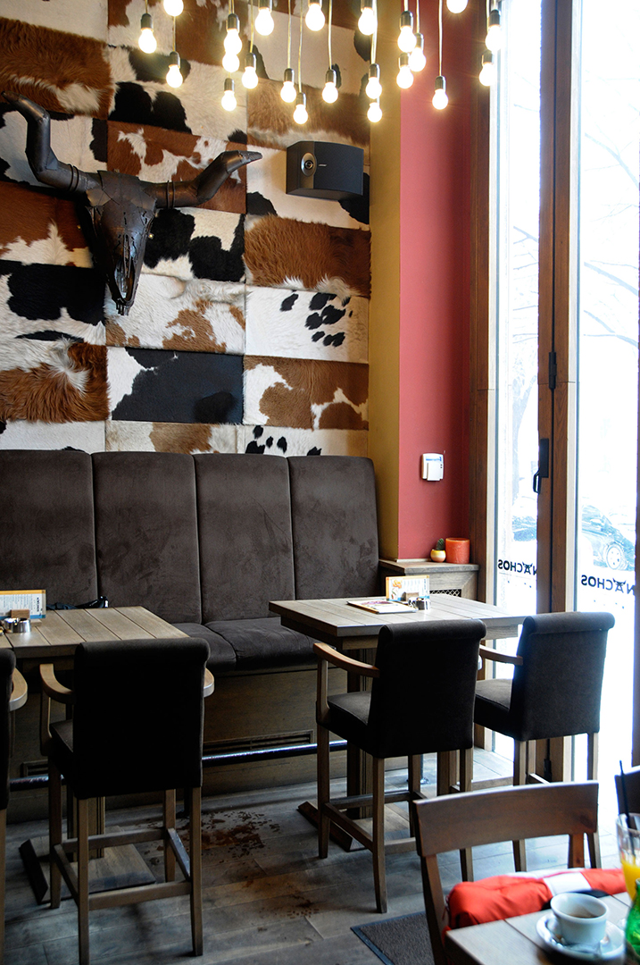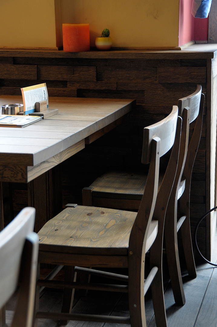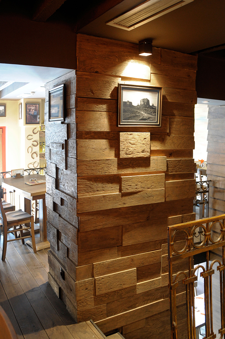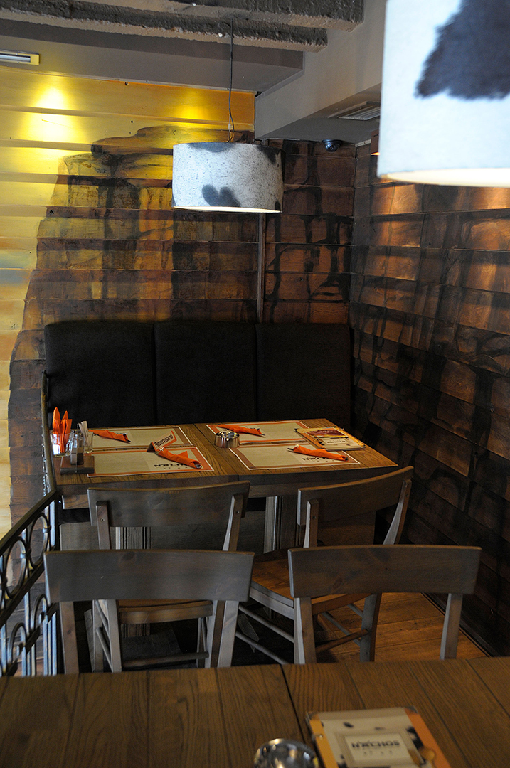 Korišćenjem jarkih boja – crvene i žute, u kombinaciji sa dominantnim drvenim površinama i zanimljivim zidnim dekoracijama, stvoren je topao i prijatan ambijent. Nameštaj izveden od drveta, rustičnog izgleda, fotografije koje unose osećaj nostalgičnosti i indirektno svetlo, odaju utisak toplog doma.