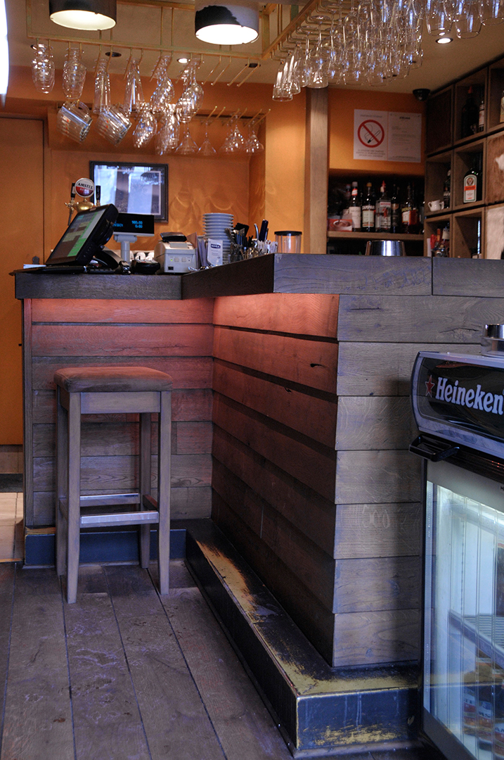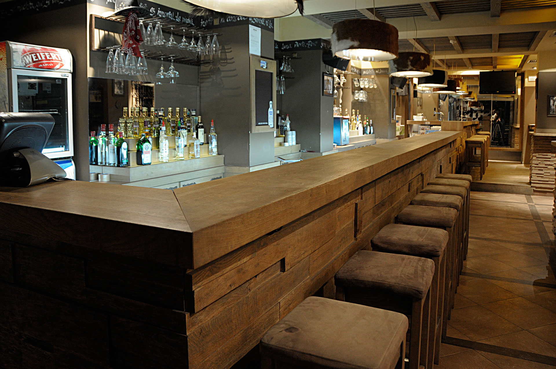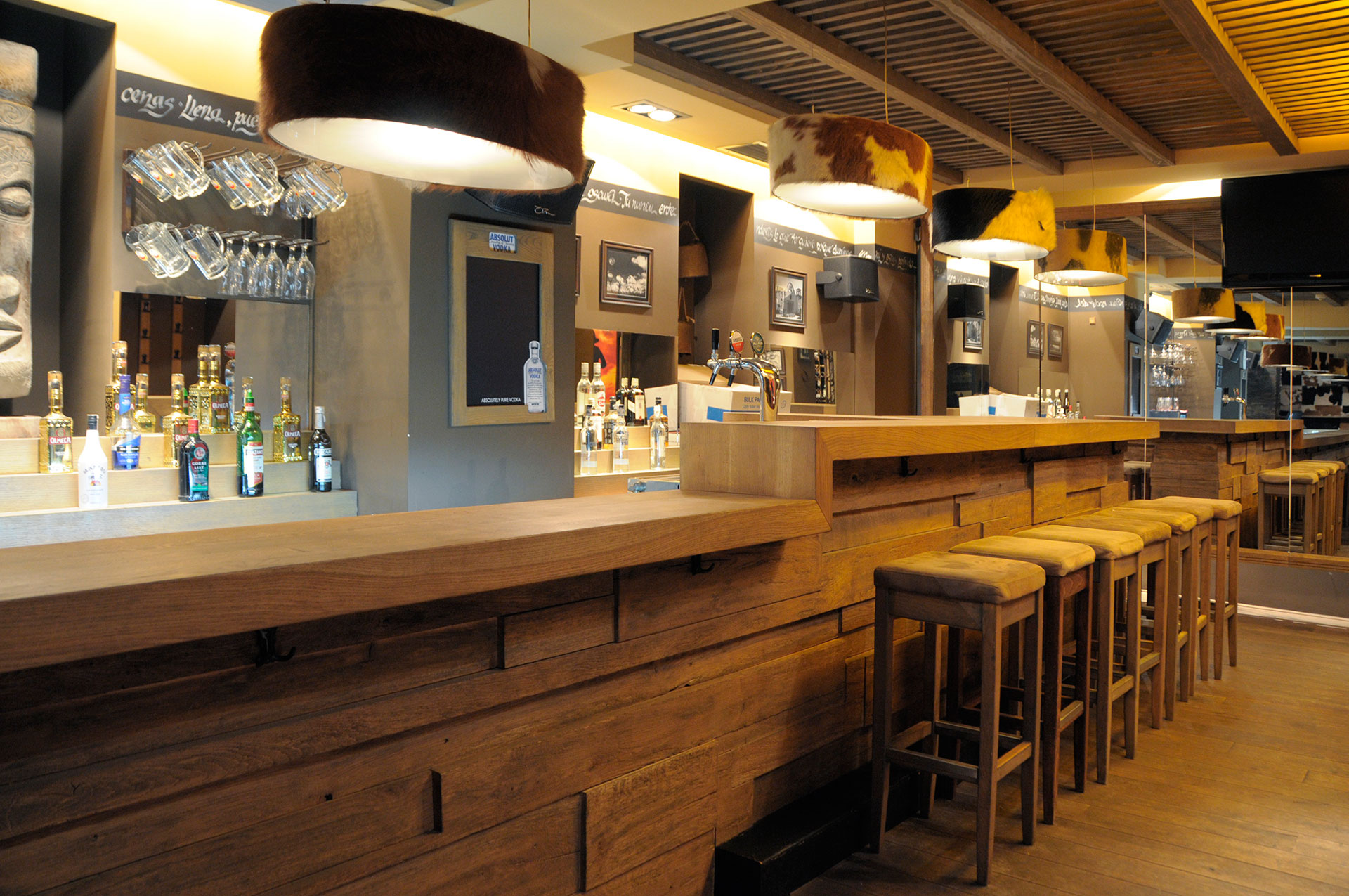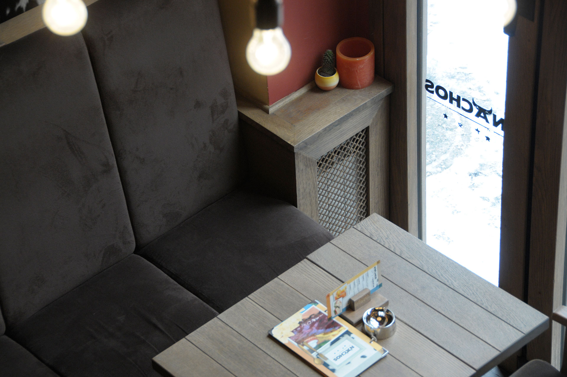 Korišćenjem jarkih boja – crvene i žute, u kombinaciji sa dominantnim drvenim površinama i zanimljivim zidnim dekoracijama, stvoren je topao i prijatan ambijent. Nameštaj izveden od drveta, rustičnog izgleda, fotografije koje unose osećaj nostalgičnosti i indirektno svetlo, odaju utisak toplog doma.
